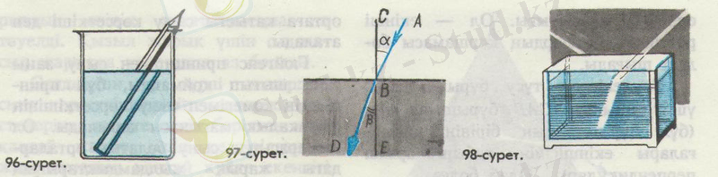 Алғашында жартылай ғана көрінген тиын енді бүтіндей көрінетін болады. Су құйылған әйнек ыдысқа көлбете қарындаш салып қояйық. Егер осы ыдысқа бүйірінен қарасақ, қарындаштың суға батып тұрған бөлігі әрегірек жылжып кеткен сияқты көрінеді (96-сурет) .