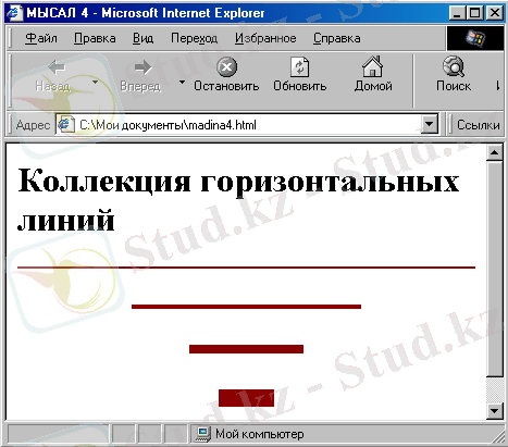 Бұл тэг көлденең сызықты сызғанда қолданылады. Тэг қосымша SIZE (сызық қалыңдығын пикселмен анықтайды) және WIDTH (сызық ұзындығын пикселмен немесе экран бетіне шаққандағы пайыз бойынша анықтайды) атрибуттарын қабылдайды. Келесі мысалда кейбір сызықтар түрі көрсетілген: