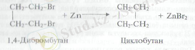 - Дигалогеналкандардың натрий немесе мырыш металымен әрекеттесуі. Бұл әдіс, Вюрц реакциясының ішкі молекулалық бәр түрі болып келеді, ол үш-, төрт- және бесмүшелік тұйықалакандарды алуға мүмкіндік береді: