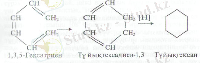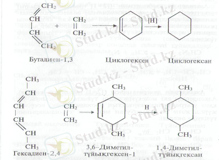 Дильс-Альдер (диенді синтез) реакциясы. Жабайы тұрғыдан алғанда, ол алкеннің қабысқан (түйіндес) диенге қосылуы болып келеді.