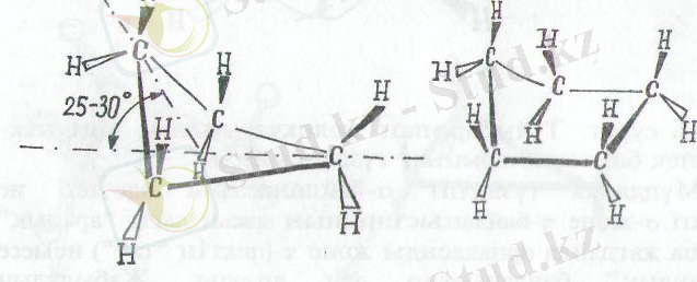 12 сурет, Түйықбутан (а) мен түйықпентан (ө) молекулаларының кеңістіктік құрылысы атомдарының біреуі кезектесіп шығады да сол әрбір сәтте көміртектің төртеуі орнында қалып отырады. Осы тұстағы сақина бейне бір үзіліссіз толқынды қозғалыста болатындай сезіледі. Бұл тербеулігці жазық емес қүрылымды "конверт" (хатқалта) деп атайды (12 ә сурет) . Бұрыштық кернеуліктің хатқалта конформациясында біраз өсетіндігіне қарамастан, бұл молекуланың торсиондық кернеулігінің төмендеуімен толықтай теңестіріледі.