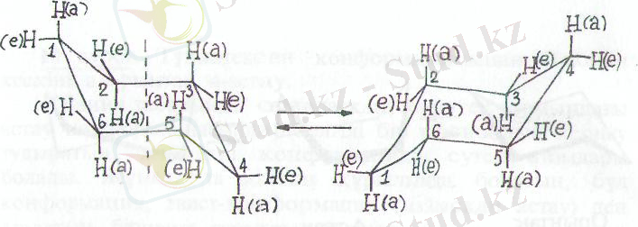 Бұл байланыстарды аксиальды деп атайды да a таңбасымен белгілейді. Қалған алты С-Н байланыстары сақина жазықтығының жанына орналасып, ралиальды бағытталады. Оларды экваториальды дейді ( таңбасы е) . Мінеки осылайша, әрбір коміртек атомында бір аксиальды, екіншісі экваториальды С-Н байланысы болады. Тұйықтықтың инверсия, яғни айналу процессінде аксиальды байланыстар экваториальды болады, және керісінше: