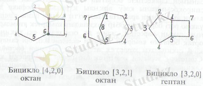 Екі сақиналы конденсирленген және баспалдақты не көпіршелі алкандардың аталуы, көміртек атом санына орайлас болатын алакан атауының алдына бицикло-(қос тұйықты) префиксін қосып құралады. Префикс пен алакан аталуының арасына квадратты жақша жақша қойып, оның ішінде екі үшіншілік (тұйындық) көміртек атомдарын жалғастыра қосатын, әрбір үш тізбектегі көміртек атомдарының санын (азаю реті бойынша) нұсқайды. Көміртек атомдарын нөмірлеуді тұйынды атомдардың бірінен бастайды және оны бастағанда алдымен ең ұзын тізбек нөмірленетіндей етіп бастайды, жалғастыра қосатын тұйынды атомдарды, сосын қысқалау тізбектерді, ал баспалдақты не көпіршелі жүйе болған жағдайда соңғы болып ең қысқа көміртектің тізбекті, яғни көпіршенің (баспалдақтың) өзін нөмірлейді: