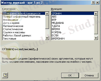 батырмасын шертеміз. Осы әрекеттердің бірін орындаған соң, экранда функцияны таңдау мүмкіндігін беретін сұхбат терезе ашылады (5. 3-сурет) . Функциялар шеберінің бұл терезесінде көрсетілген тізімнен өзімізге қажетті функцияны таңдап аламыз. Осы терезенің төменгі бөлігінде функцияның атқаратын қызметі жөніндегі анықтаманы оқуға болады.