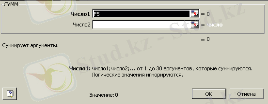 Осы терезеде функцияның және аргументтерінің анықтамасы көрсетілген. 1-ші сан (Число 1) мәтіндік өрісіне сан, ұяшыққа сілтеме формула немесе басқа функция енгізуге болады .