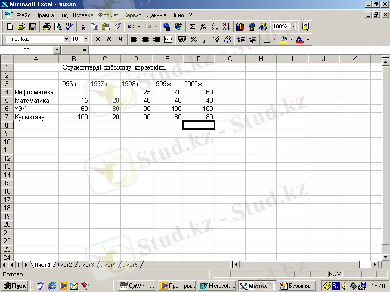 Келтірілген көрсеткіштерді мысал ретінде қабылдай отырып, 5. 7-суреттегі мәліметтердің көмегімен сәйкес мамандықтар бойынша университетке студенттер қабылдау деңгейін көрсететін диаграмма құру қажет болсын. Алдымен қажетті аралықты, мамандықтар аттарын және қажетті жыл бойынша көрсеткіштер жазылған А3:F7 аймағын белгілейміз. Одан кейін саймандар тақтасындағы Диаграммалар шебері батырмасында тышқанды шертеміз.