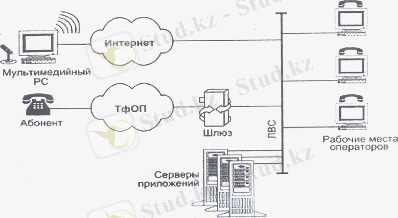 Біз контакт орталықтар деп, операторлардың көмегімен әртүрлі байланыс желілері, оның ішінде интернет жүйесі арқылы бір мезгілде көптеген пайдаланушыларға мультимедиалық ақпараттық қызметтер көрсететін, шақыруларға қызмет көрсету орталығының өзара байланысты аппаратық-программалық кешенін айтамыз. 1-суретте контакт орталықтың құрылымы келтірілген. Контакт орталығының әмбебаптылығы келесі мүмкіндіктерді жүзеге асыра алатындығынан көрінуге тиісті: