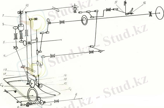 Төменгі қозғағыш ролик С 1 тігіс қадамын өзгеткіш қорап арқылы айналмалы қозғалысқа келеді. Білік 2 - де айналдырғыш дегене 3 фрикциялы муфта 4 арқылы жалғанған, бұл роликкі жұмыс кезінде жиектің қисықтығына қарай қажетінше қозғалыс жасау мүмкіндігін береді. Жоғарғы тасымалдағыш ролик С 2 қозғалысты білік 5 тісті дегенелер 6 және 4 муфта сияқты жұмыс істейтін солқылдақ буын 9 тұрады. Ине В тігіс бағытымен қозғалысты эксцентрикті рычагтар жүйесі арқылы алады, ауытқу мөлшері рычаг 11 сектор саңылауымен бұрып, гайка 16 - мен бекіту арқылы орындалады (сурет 3 ) .