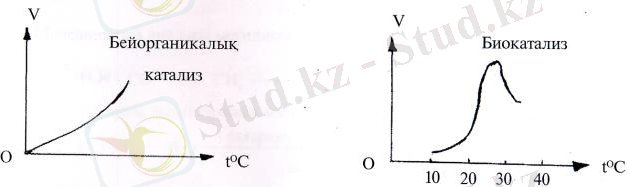 - Ферменттердің "термолабилдігі", яғни белгілі температурада оптималды активтілік көрсетеді. Мысалы: t = 37-42°; одан жоғары температурада денатурацияға ұшырайды.
