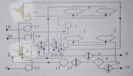 1, 13, 16-сораптар; 2-жылуалмастырғыш; 3-буқыздырғыш; 4, 7- араластырғыштар; 5, 6-электродегидратор; 8, 10, 11-тоңазытқыштыр; 9-мұнай бөлгіш; 12-сыйымдылық; I-шикі мұнай; II-тұздан арылған мұнай; III-деэмульгатор; IY-тұзды ерітінді; Y-тазасу; YI-су буы; YII-конденсат;