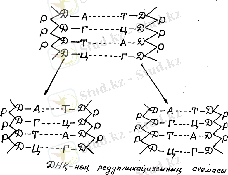 Тұқым қуалайтын информациялардың берілуінің бірінші кезеңі клетка ядросының бөлінуінен басталады. Бұл кезде, ядродағы ДНҚ-ньщ сутектік байланыстары үзіліп, қос спиральден бір-бірден тізбек пайда болады. Бұл тізбектегі полинуклеотидтер өзінің комплементарлығын сақтап, жаңадан, бастапқыға ұқсас екі қос спираль түзеді. Бұл процесті ДНҚ-ның редупликациясы дейміз.