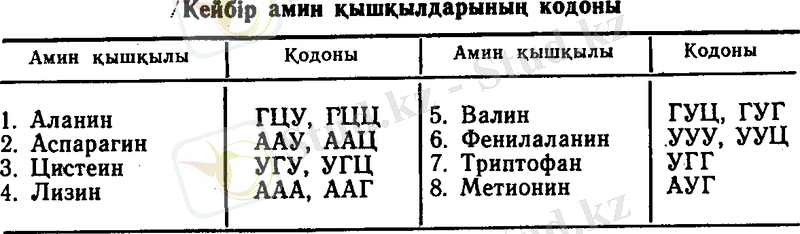 Тұқым қуалау белгілері ұрпаққа қалай беріледі? Әр түрлі белоктардың биологиялық қасиеттері, олардың құрамындағы амин қышқылдарының бір ретпенен орналасуына байланысты. Бұл амин қышқылдарының кезегін ДНҚ-ның құрамындағы үш нуклеотид - генетикалық код реттейді. Ол код үш нуклеотидтен тұратын болғандықтан триплеттік код деп - атайды, яғни бір амин қышқылы белок тізбегінен орын алу үшін, бір триплет жауап береді.
