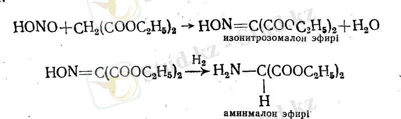Амин қышқылдарын синтездеудің тағы бір тәсілі аминмалон эфирі негізінде құрылысы мынадай - С - СООН қалдықты қышқылдар алу. Аминмалон эфирі мен азотты қышқылдық әрекеттесуінен алынатын өнімді тотықсыздандыру арқылы алынады: