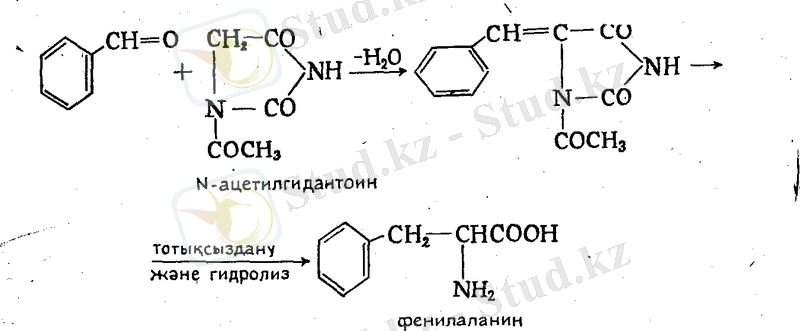 Гидантоинды, құрамында аррматты альдегидтермен конденсация ряакциясына кірісе алатын активті СН 2 тобы болғандықтан, күрделі амин қышқылдарын алу үшін аралық өнім ретінде пайдалануға болады. Бұл жағдайда гидантоин қорғаушы тобы бар ацетилгидантоин түрінде қолданылады: