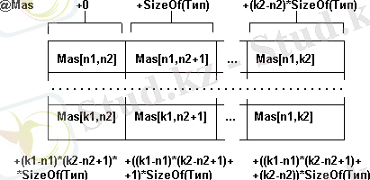 Физикалық құрылым. Физикалық құрылым - бұл ЭЕМ жадысында жиым элементтерін орналастыру. (k1-n1+1) жолдан және (k2 -n2+1) бағаннан тұратын екіөлшемді жиымның физикалық құрылымы келесі суретте көрсетілген.