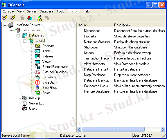 Мәліметтер қорын құру «Database» қатарының бөлімінде бейнеленеді. Егер қатарда «TUTORIAL» атын ерекшелесек, онда таңдалған мәліметер қорымен орындауға болатын операция тізімі оң жақ бөлікке шығады(9-сурет) .