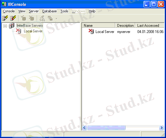 InterBase сервері жұмыс істеп тұрғанына көз жеткізгеннен кейін, оған қосыламыз. Ол үшін басты мәзірдегі «InterBase» бумасынан IBConsole бағдарламасын жүктеу керек (2-сурет) .