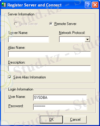 IBConsole бағдарламасында сервермен жұмыс істеу үшін, оған тіркелу керек. Ол үшін Server Register мәзір пунктін таңдаңыз. Тірекелудің диалог және серверге қосылу терезесі экранға шығады(3-сурет) .