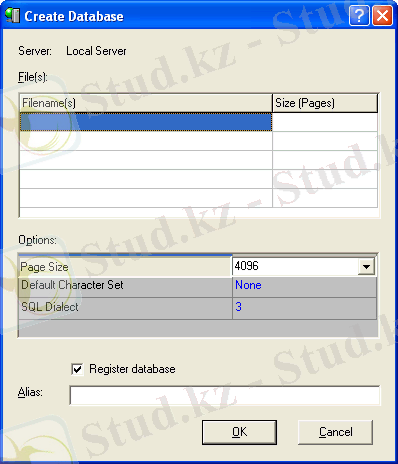 Серведе жұмыс істеуге болатын аты алғанннан кейін, мәліметтер қорын құрып және онда мысал ретінде бір кестені көрсетеміз. Gdb кеңейтілуі бар, InterBase серверінің мәліметтер қоры файл түрінде беріледі. Жаңа мәліметтер қорын құру үшін мәзірден Database Create Database пунктін таңдаймыз. Диалог терезесінде мәліметтер қорын (7-сурет) құрғанда келесі мәліметтерді енгізу керек: