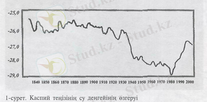 Каспий экологиясы - Каспий теңізінде мұнай-газ өндіру және мұнай өндеу кешендерінің дамуына байланысты Қазақстанның батыс өңірінде қалыптасқан табиғи, әлеуметтік, экономикалық және экологиялық жағдай. Каспий теңізі - әлемдегі шаруашылық маңызы зор ең ірі тұйық су алабы. Жыл бойына Каспий теңізінің деңгейі жел-қума-желбөгет құбылыстарының нәтижесінде 0, 5 - 1 м-ге дейін ауытқып отырады, 1837 - 1990 ж. жүргізілген бақылау жұмыстарының нәтижесінде Каспий теңізінің су деңгейі мөлшерінің айтарлықтай өзгеруі 1930 және 1980 - 90 ж. аралығына сәйкес кездесетіні анықталған. 1929 - 41 ж. су деңгейі 2 м-ге төмендесе, 1977 ж. бұл көрсеткіш ең төменгі абс. мөлшеріне (-29, 01 м) жетті. 1978 - 95 ж. су деңгейі 2, 35 м-ге қайта көтеріліп, 1995 ж. бұл көрсеткіш - 26, 66 м болды (қ. 1 сурет) .