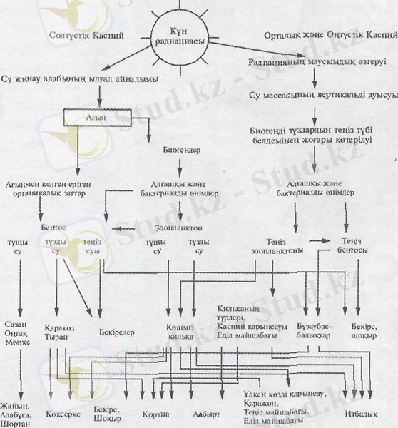 Су деңгейінің тұрақсыздығы - климаттың өзгеруінен теңіз суының молаюына байланысты болып отырған құбылыс. Судың тұзд. 0 - 12%о. Каспий теңіз морфология жағдайына байланысты Солтүстік Каспий, Орталық Каспий және Оңтүстік Каспий болып бөлінеді. Теңіздің қазақстандық бөлігі - солтүстік-шығыс жағалауы Атырау және Маңғыстау облыстарының аумағында. Солтүстік Каспий теңіздің басқа бөліктерінен өзінің алып жатқан география орны, теңіз түбінің құрылымы, тұздылық және температуралық режимі, су теңгермесі (балансы) жөне т. б, бойынша ерекшеленеді. Оңтүстік және Орталық Каспийге қарағанда таяз. Солтүстік Каспий бөлігінің аум. 80 мың км 2 . Оған келіп құятын өзендердің жылдық су ағымының жиынтығы - жалпы Каспийге құятын барлық өзен сулары ағымының 88%-ін құрайды. Теңіздің бұл бөлігі жануарлар дүниесі мен өсімдіктер әлеміне бай. Мұнда жануарлардың 2 мыңға жуық түрі (оның ішіңде омыртқасыздар - 1069, омыртқалылар - 415, паразит жануарлар -325) тіршілік етеді. Теңіз фаунасының негізін эндемик жануарлар (шаянтәрізділердің 60%-і, моллюскілердің 80%-і, балықтардың 50%-і) құрайды. Каспий теңізінің балық қоры 2, 9 млн. т болса, оның 40%-і Солт. Каспий бөлігінің үлесіне тиеді. Каспий теңіз - ежелден балық ауланатын маңызды су айдыны. Бекіре тәрізділердің дүниежүзі өнімнің 90%-і осында ауланады. Соңғы кезде балықтардын уылдырық шашатын жерлеріне жетуге кедергі келтіретін өзендерге салынған бегеттер, судың радиациялык және химиялық жолмен ластануы және қаскөйліктің (браконьерлік) етек алуы бекіренің қорын азайтуда. Сондай-ақ, мұндағы қоыртпа, пілмайдың жылдан-жылға саны кеніп бара жатыр. Каспий миногасы, Еділ майшабағы, Каспий албырты, ақбалық, күтім - Қазақстанның "Қызыл кітабына" енгізілген. Қазіргі заманнын балық ш. - балық аулауды реттеу, аса бағалы балық түрлерін (бекіре, қортпа, шоқыр жөне пілмай) табиғи және жасанды жолмен көбейту жұмыстарына негізделген. Жыл сайын 11 балық з-ты (Ресейдің, Әзербайжанның, Қазақстанның) Каспий теңізіне 75 млн. балық шабақтарын жібереді. 1998 жылдан бері Атыраудағы 2 балық з-ты жылына 6 млн. бекіре балығының шабағын дайындайды. Балықтар уылдырығын тұщы суға шашады, қор жинау үшін тұзды суға шығады. Мыс., шортан, оңғақ, қызылқанат балық, алабұға теңіздің атырауына (дельта) дейін өрістесе, қаракөз, табан, көксерке тұзды суда (түзд. 10 - 11% о ), ал бекіре тәрізділер судың өте тұзды жерінде тіршілік етуге бейімделген. Каспий теңізінде 2 тропиктік жүйе қалыптасқан (2-сурет) .