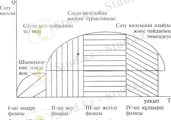Өнімді жоспарлау процесінде жііңа тауардың нарыкта пайда болуын анықтау өте маңызды. Мүны анықтауға тауардың циклдык өміршеңдігі кемектеседі. Тауардың циклдык. өміршеңдігіне сатушының әрбір төрт фазадағы (стадия) пайда деңгейі тікелей тәуелді: а) нарыққа тауарды еидіру; ә) сату көлемінін өсуі; б) жетілу фазасы; в) қүлдырау фазасы. Тауардың циклдык өміршендігінін типтік моделі график түрінде 18-1 суретте бейнеленген: