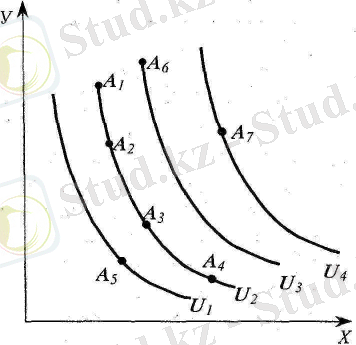 4. 3-суретте көрсетілген А жиыны талғамсыздық қисықтарына ортақ қиылысу нүктесінде орналасқан. A жиыны U 1 талғамсыздық қисығында орналасқандықтан тұтынушы А мен В ны айырмайды. Соған ұқсас U 2 қисығындағы С жиынын А жиынынан айырмайды деген тұжырым шығады. Бұдан айтатынымыз тұтынушы В мен С жиындарын бір-бірінен айырмашылық жасамайды.