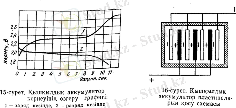 Аккумуляторды зарядтау кезшде электролиттің тығыздығы ар-тады, соның салдарынан аккумулятор қысқыштарында кернеу де жоғарылайды (1-кисык) . Қышкылдық аккмууляторды разрядта-ғанда, оның қысқыштарындағы кернеу жылдам 1, 85-1, 8 В-қа де-йін кемиді одан соң тез арада нольге дейін азаяды (2-қисық) . Ак-кумулятордың разрядталу кезіндеп кернеудің азаюы электролит тығыздынының кемуіне байланысты түсіндіріледі. Аккумулятор кернеуі 1, 8 в (кысқа уакыт боиы разрядталғанда - 1, 75 В) мөл-шеріне жеткен болса, онда аккумулятррда жиналған энергияның барлығы жұмсалынды деген сөз (екі тілікте де токты нашар өткі-зетін қорғасын сульфаты түзіледі) . Разряд процессін арман қарай жүргізсек, кернеу тез арада нольге дейш темендейді. Егер аккуму-ляторды жүктемеден ажыратып тастасақ, онда кернеу қайтадан шамамен 2 В дейін еседі. Өйткені, электролит тіліктерге, актив массасының саңылауларына тереңдеп енеді. Бірақ та мұндай ак-кумуляторды жүктемеге кайтадан қрссақ, оның кысқыштарында «ернеу тез нольге дейін азайып кетеді.