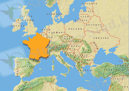 Француз Респ. - Бас. Еуропадағы iрi капит. мемлекеттердiң бiрi. Жерiнiң аумағы жөнiнен шетелдiк Еуропада I орын алады. Солт. және солт. шығ. Бельгиямен, Германиямен, шығысында Швейцария, Италиямен, оңт. - батысында Испаниямен шектеседi. Солт. - батысын Па-де-коле базы, батысында Атлант мұхитының Бискай шығанағы, оңтүстiгiн Жерорта теңiзi шаяды. Оң. Корсика, Жерорта теңiздiк және Бискай шығанағындағы бiрқатар шағын аралдар Ф-ға қарайды. Жерi 551, 6 мың км