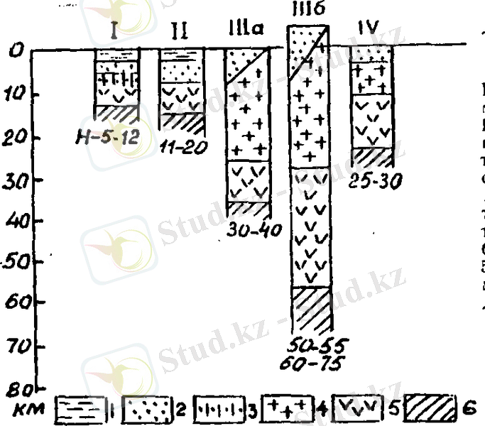 I - мұхиттық тегі; II - суб-мұхиттық тегі - ойпандар; III - континентальдық тегі - жазықтықтар (а) және тау алқаптары (б) ; IV - субконтинентальдық тегі; I - су қабаты; 2 - шөгінді тау жыныстары; 3 - мұхиттық қыртыстың екінші қабаты; 4 - гранитті қабат; 5 - базальтты кабат; 6 - мантия (Нм - мантия тереңдігі) .