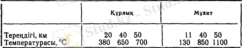 100 км тереңдікте температура - ІЗОО^С (вулкандық лавалардың температурасы осыған жақын деп саналады) . 400 км тереңдікте температура - 1700°С, 2900 км - 3500°С, 5000 км - 5000°С болады деп есептеледі.