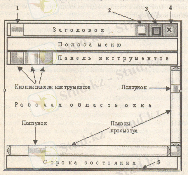 1-Жүйелік меню батырмасы; 2-Терезені пиктограммаға айналдыру батырмасы; 3-Терезені қалпына келтіру және максималдау батырмасы; 4-Терезені жабу батырмасы; 5-Терезе өлшемдерін өзгерту жақтауы;