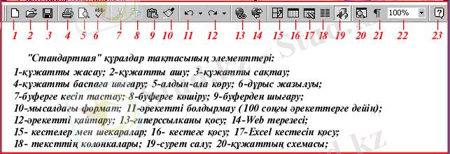 1-құжатты жасау; 2-құжатты ашу; 3-құжатты сақтау; 4-құжатты баспаға шығару; 5-алдын-ала көру; 6-дұрыс жазылуы; 7-буферге кесiп тастау; 8-буферге көшiру; 9-буферден шығару; 10-мысалдағы формат; 11-әрекеттi болдырмау (100 соңғы әрекеттерге дейiн) ; 12-әрекеттi қайтару; 13-гиперссылканы қосу (гиперссылка-бұл қажеттi объект: сөз немесе бiрнеше сөз, тышқанды басу арқылы қосымша ақпаратты алуға болады. Көбiнесе, гиперссылка түспен бөлектенедi, яғни негiзгi мәтiннiң түсiнен айрықша) ; 14-Web терезесi (құжатты гиперссылкамен көрудi жеңiлдету үшiн жасалған, мысалы, Internet жұмысында) ; 15- кестелер мен шекаралар; 16- кестеге қосу; 17-Excel кестесiн қосу; 18- мәтiннiң колонкалары; 19-сурет салу; 20-құжаттың схемасы; 21-баспаға шықпайтын символдар; 22-"масштаб" алаңы; 23-көмекшi.