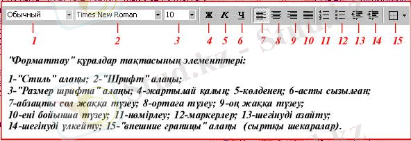 1-"Стиль" алаңы; 2-"Шрифт" алаңы; 3-"Размер шрифта" алаңы; 4-жартылай қалың; 5-көлденең; 6-асты сызылған; 7-абзацты сол жаққа түзеу; 8-ортаға түзеу; 9-оң жаққа түзеу; 10-енi бойынша түзеу; 11-нөмiрлеу; 12-маркерлер; 13-шегiнудi азайту; 14-шегiнудi үлкейту; 15-"внешние границы" алаңы (сыртқы шекаралар) .