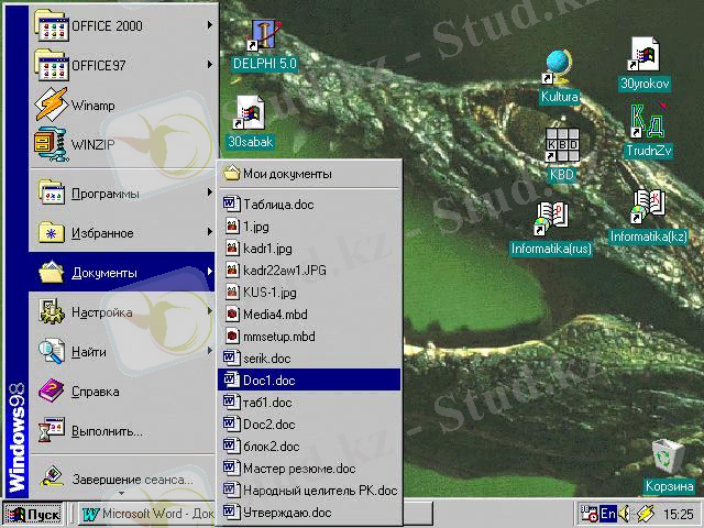 3. Word құжатын Басты Менюдегi "Документы" ("Құжатты") пунктын таңдау арқылы ашуға болады. Тiзiм құжаттарды» атауларынан тұрады (15 файлға дейiн), олар берiлген компьютерде соңғы болып өңделген.