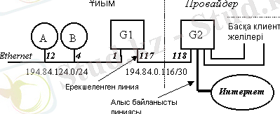 Шын мәніндегі локалдық желі ұйымының Интернетке қосылу мысалын қарастырайық(2. 3. 2 сурет) . Локалдық желінің IP-адресі - 194. 84. 124. 0/24. Осы желіге G1 маршрутизаторы қосылған. Ethernet локалдық желісіне қосылған осы маршрутизатордың IP-интерфейсінің адресі 194. 84. 124. 1. Екінші маршрутизатор IP-интерфейсі басқарушы провайдер Интернетке алып баратын ерекшеленген линияға(синхронды тізбектелген канал) қосылған. Осы линияның екінші ұшына провайдерге жататын G2 маршрутизатордың IP-интерфейсі қосылған. Осы екі интерфейс бөлек желіні 194. 84. 0. 116/30 құрастырады. Бұл желіде интерфейс номеріне 2бит орын - 4 ваоиантты адрес бөлінген, олардың ішіндегі біреуі (00) сол желіні, екінші біреуі (11) - кеңтаратылымды білдіреді. Сол себебті, осыған ұқсас желілерде барлығы 2 түйін болуы мүмкін - бұл ең минималды болатын желі. Желідегі 194. 84. 0. 116/30 G1маршрутизаторының интерфейсі адресі 194. 84. 0. 117 мынадай, ал G2 маршрутизаторыныңкі - 194. 84. 0. 118 мынадай. G2 маршрутизатор тағыда бірнеше интерфейстерді керек етеді, яғни лоардың бөлігіне қосылатындар басқа линиядағы клиенттер, коммуникациялық центрдіңлокалдық желісі, басқада маршрутизаторлар және алыстағы байланыс үшін магистралды линиялар.