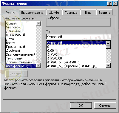 ұяшықтағы сандарды әртүрлі форматта бейнелеуге болады. Мысалы: 100 санын былай жазуға болады: 100, 00 тенге - ақша түріндегі форматта; 1% проценттік түрде; 1, 00Е+02-ғылыми түрде.