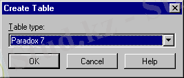 Ең алдымен жаңа таблица құруда оның форматы Create Table (Таблица құру) терезесінде (1-сурет) таңдалады. Өздігінен Paradox 7 таблицасының форматы ұсынылады және біз де осыны пайдаланамыз. Өзге де таблицалар форматтары үшін, мысалға, dBase ІV үшін де дәл осы қадамдар қайталанады.