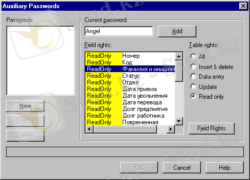 Password тізіміне қосымша парольдер енгізіледі. Table rіghts ауыстырғыштар тобы таблицада толығымен келесідей құқықтарды пайдалану мүмкіндіктерін анықтайды: