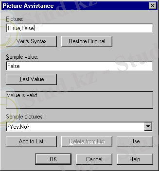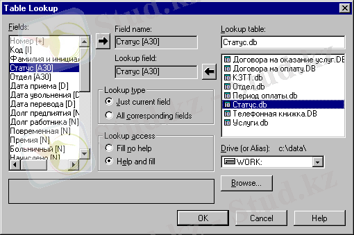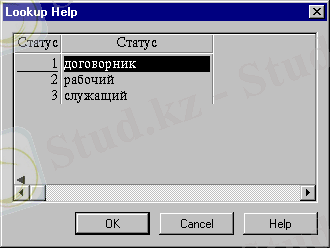 Lookup access ауыстырғыштар тобы таңдау таблицасының мәндері пайдаланушымен қалай қолданылатынын анықтайды. Егер Fіll no help (Көмексіз енгізу) ауыстырғышы таңдалса, онда пайдаланушы таңдау таблицасының мүмкін мәндерін жақсы білуі тиіс және таңдау таблицасы берілген алаңдағы мүмкін мәндерді өзі енгізеді, ал егер Help and fіll ауыстырғышы таңдалса, онда мәндерді таңдау таблицасының мәндерінен құралған тізімнен (14-сурет) таңдауға болады. Бұл тізім <Ctrl>+<Бос орын> клавивишалар комбинациясын басу арқылы шақырылады.