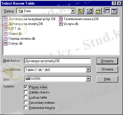 Жаңа таблица құрарда, таблицаның форматын анықтағаннан кейін, таблицаның құрылымын құрмай-ақ оны басқа таблицадан көшіріп алуға болады: Borrow . . . (Қарызға) кнопкасын басқанда Select Borrow Table (Құрылымы көшірілетін таблица таңдау) терезесі (3-сурет) ашылады.
