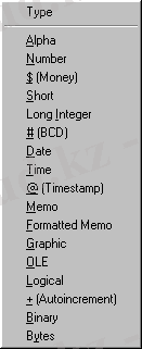 Алаң аты таңдалған таблица форматына белгіленген тәртіп бойынша беріледі. Paradox таблицалары алаңдарының аты әріптер (кириллицаны да қолдануға болады) мен сандардан тұруы мүмкін және әріптен басталуы тиіс. Аттың максималды ұзындығы - 25 символ. Ал алаңдардың типтеріне келсек, олар төмендегі кестеде көрсетілген: