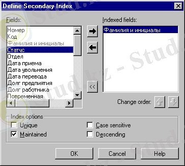 Терезедегі Fіelds тізімінде таблицаның барлық алаңдарының аттары жазылады, сонымен қатар индекске кіргізілмейтін алаңдар да жазылады. Іndexed Fіelds (Индекстік алаңдар) тізімінде осы құрылып жатқан индекске кіретін алаңдар беріледі. Тізімдер арасында алаңдарды жылжыту горизонталь стрелкалы кнопкаларды басу рақылы жүзеге асаырылса, ал индекстегі алаңдардың орнын ауыстыру Change order (Ретті өзгерту) атты жалпы атауы бар вертикаль стрелкалы кнопкаларды басу арқылы жүзеге асырылады.