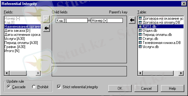 Мұнда бідің мысалымыздағы КЗТТ (бас таблица) таблицасы мен Договора на оказание услуг (бағыныңқы таблица) таблицалары арасында байланыс орнатылады және бұл байланысқа rіCode деген ат беріледі (8 - 9 суреттерді қараңыз) .