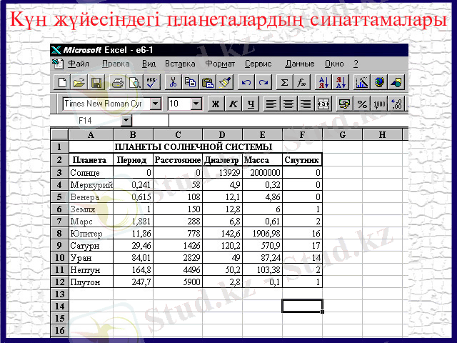 Біз мәліметтер қоймасын жасап, олардың ішіндегі элементтерінің әртүрлі белгілеріне қарай керекті информацияны іздеу мен оларды сұрыптау ісін қарастырамыз. Осыларды түсіндіру үшін 1-суретте көрсетілгендей күн жүйесі планеталары жөнінде мәліметтермен кестені толтырайық та, оны Eх6. xls деген файлға жазып сақтап қояйық.
