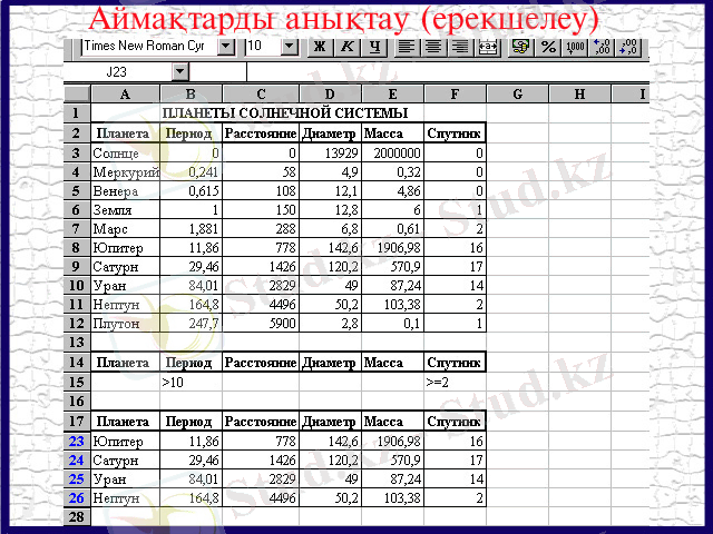 Егер де біз енді Масса өрісіндегі батырманы басып, оның Шарт (Условие) пунктін таңдап, сұхбат терезесіне басқа критерий (<2000) енгізсек, онда тізімде тек Юпитер планетасы қалғанын көреміз. Бастапқы берілген мәліметтер қоймасын көру үшін Деректер-Фильтр-Бәрін көрсету (Данные-Фильтр-Показать все) меню командаларын орындау керек.