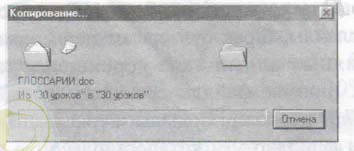 Енді таңдап алынған файлдардың орнын ауыстыру үшін курсорды сол ерекшелеп объектінің бір шетіне алып барып, тышқан батырмасын басу керек, сонда файлдармен әрекет жасалатынын көрсететін жылжымалы белгіше пайда болады. Тышқан батырмасын сол басулы күйінде ұстап тұрып, жылжымалы белгіні файл көшірілуте тиіс бума белгісіне жеткіземіз де, батырманы қоя береміз. Осының нәтижесінде файлдың орнын ауыстыру (жылжыту) орындалады, егер ол ұзақ уақыт жүргізілетін болса (файл көлемі үлкен болғанда), 11. 2-суреттегідей көрініс экранда бейнеленіп әрекеттің ұзақтығын көрсетіп тұрады. Мұның нәтижесінде мәліметті көшіру немесе орнын ауыстыру әрекетінің орындалуы, келісім бойынша, информацияны беретін және оны алатын объектілердің орнына байланысты болады.