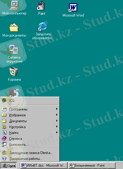 Тышқанмен «Іске қосу» («Пуск» ) батырмасын басу Windows 98 - дiң бас менюiн ашады.