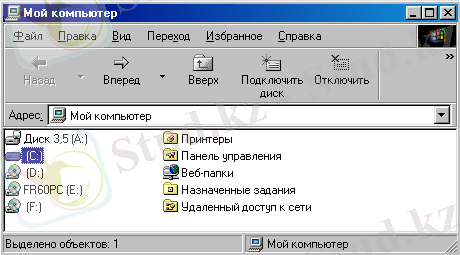 Жұмыс столындағы «Мой компьютер» (менiң компьютерiм) таңбашасы, бүкiл компьютер түтас сол белгiнiң iшiнде деген мағынаны бiлдiредi. Компьютердегi бумалар мен файлдарды қарау үшiн, ол таңбашаға тiлсызықты апарып, екi рет сол жақ батырманы басу керек (1. 3. сурет) .