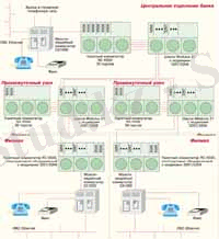 Банктің орталық бөлімшесінде (1-суретті қараңыз) орнатылғандар: алты процессорлы модульдері бар 36 портқа арналған RC6500 комутаторы және Motorola 3268 магистральді модемдері бар екі шасси.